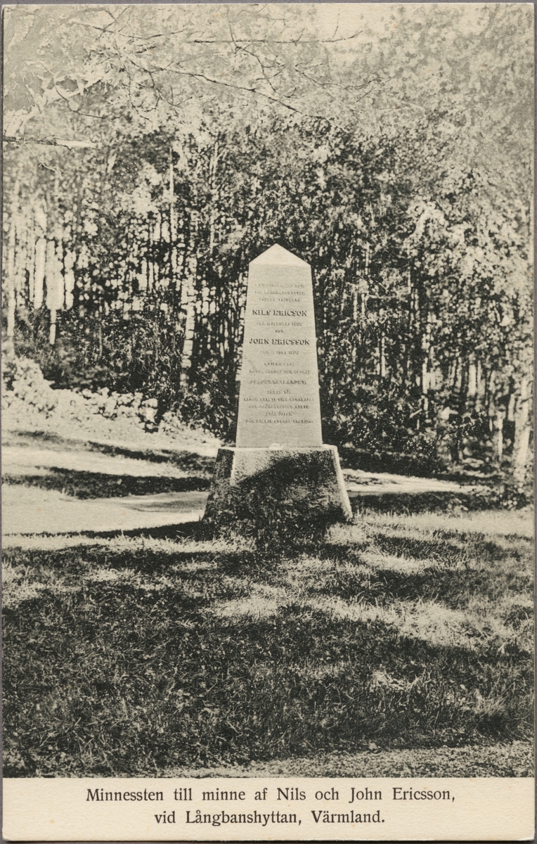 Titel: Minnessten vid Långbanshyttan över bröderna Nils Ericson och John Ericsson födda där 1802 och 1803.
