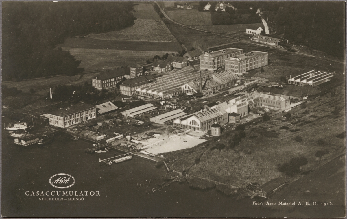 Flygfoto över Aktiebolaget Gasaccumulator, AGA, i Lidingö.