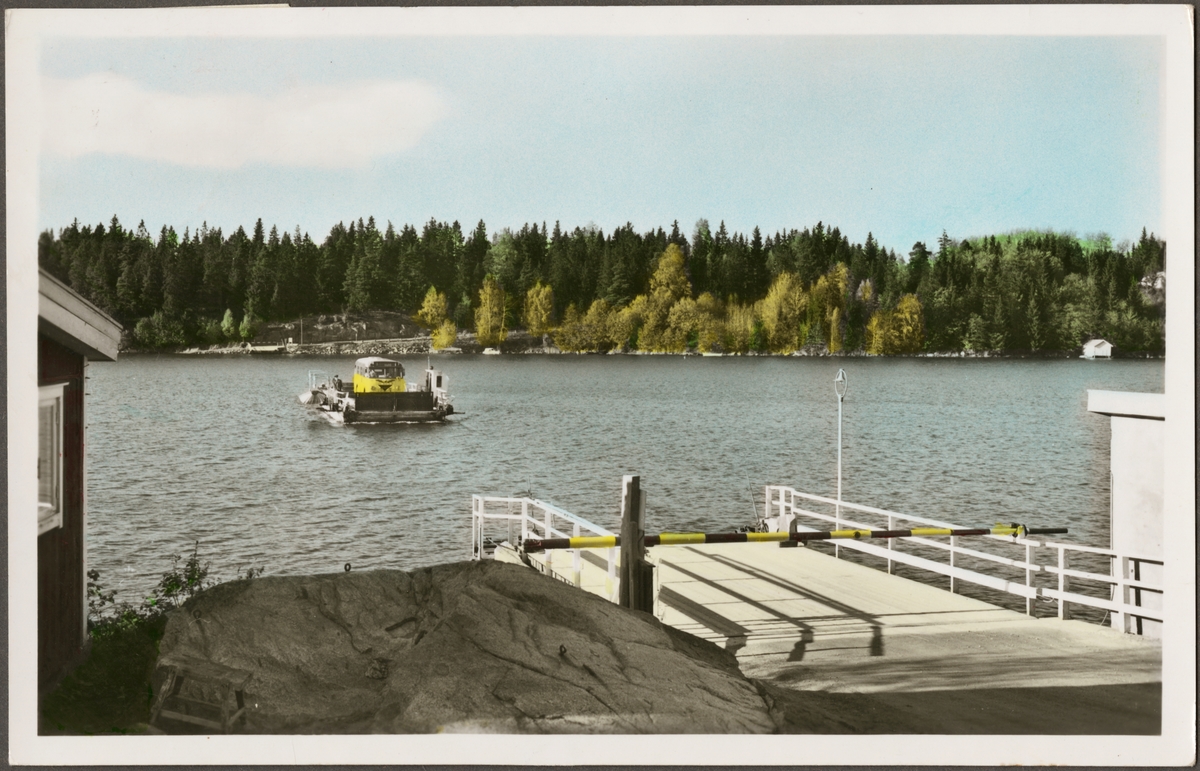 Färjeläget i Vätösund. Handkolorerat vykort.