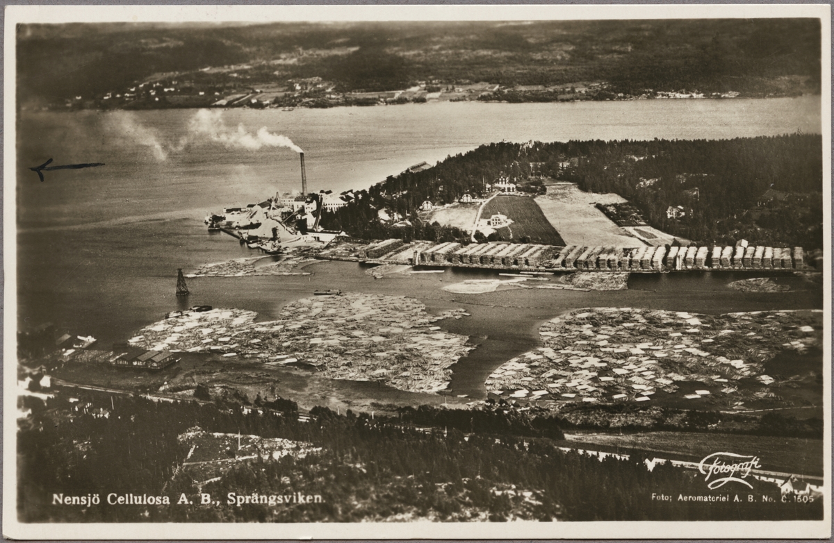 Flygvy över Nänsjö fabriksområde vid Ångermanälven.