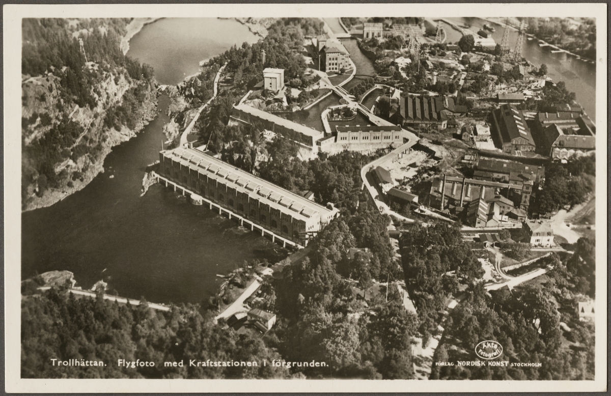 Flygfoto över industriområde med Olidan kraftverk, Trollhättan, vid Götaälv.