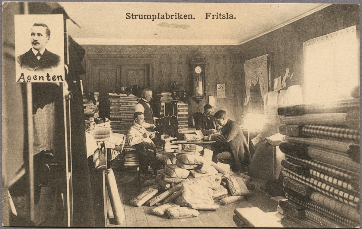 Titel: Interiör från strumpfabriken i Fritsla med agentens porträtt infällt.