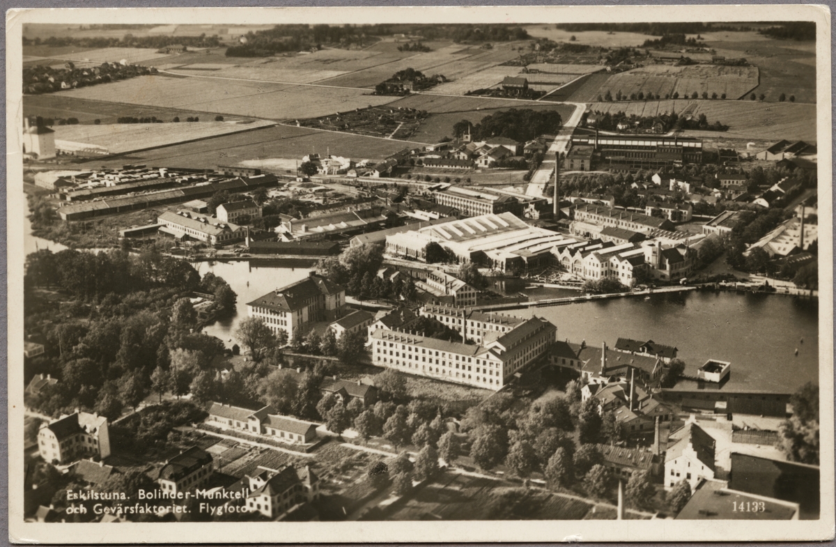 Titel: Flygvy över Eskilstuna med vapenfabrik och Munktell verkstäder.