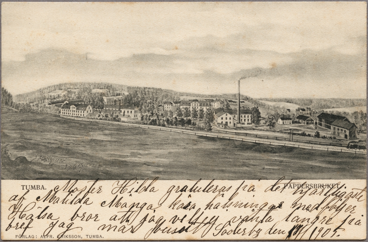 Titel: Konstverk på vykort med Tumba Pappersbruk.
