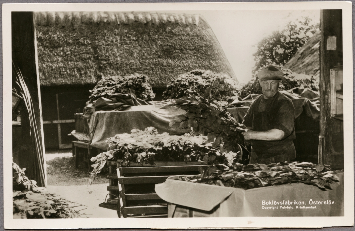 Titel: Packning av löv i boklövsfabriken i Österslöv.