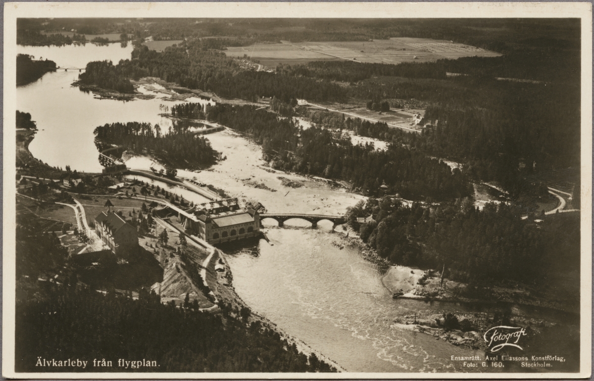 Flygfoto över Älvkarleby kraftverk, ställverk och bro.