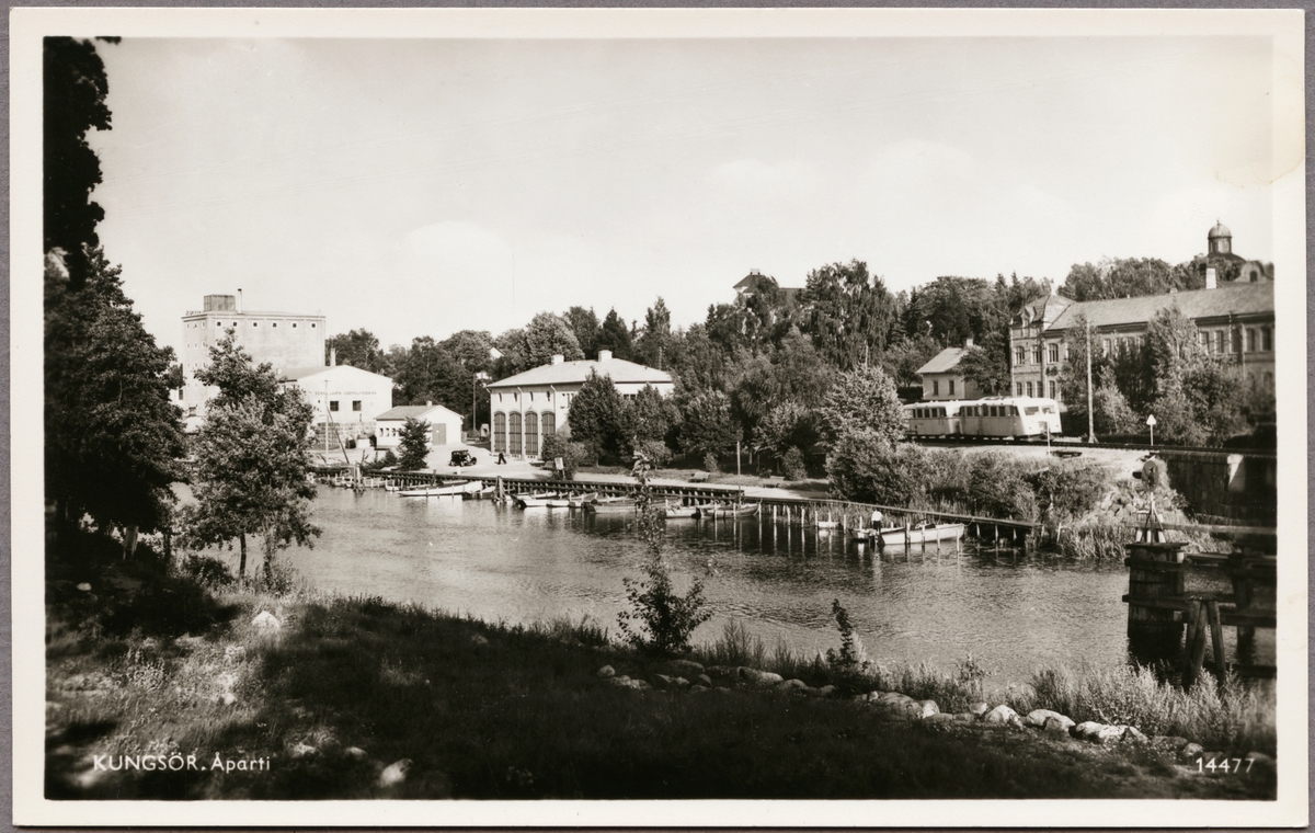 Titel: Vy över Arbogaån i Kungsör med motorvagn i bakgrunden.