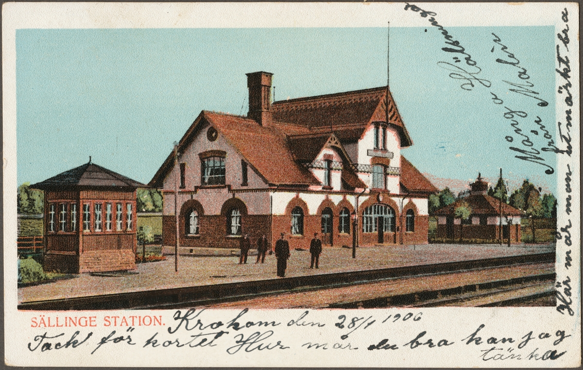 Titel: Spårsida av station med ställverk och uniformerad personal.