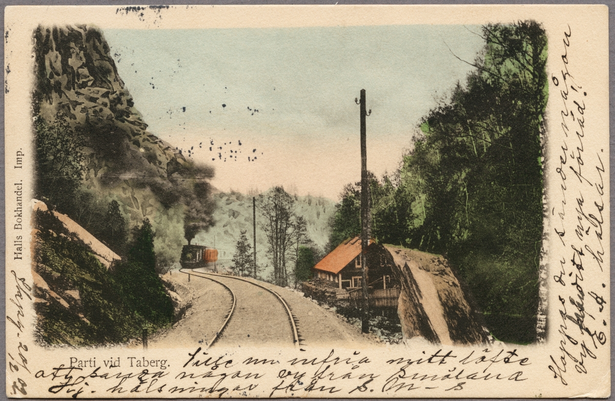 Titel: Järnväglinje med tåg vid hus och bergsluttning.