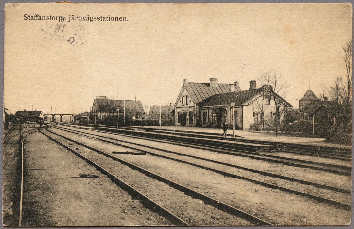Titel: Vy på bangård och stationsområde med man på perrong.