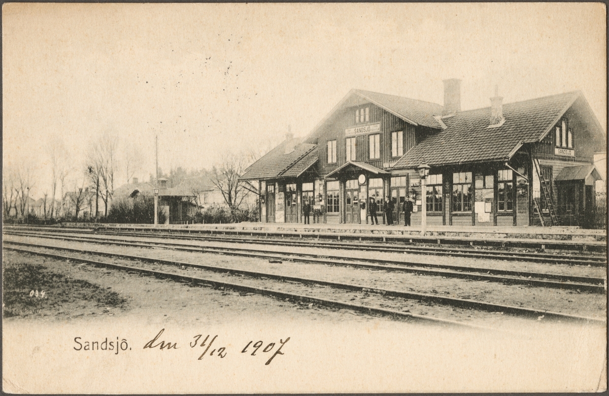 Titel: Spårsida av Sandsjö station med vy på stationshus och del av bangård.