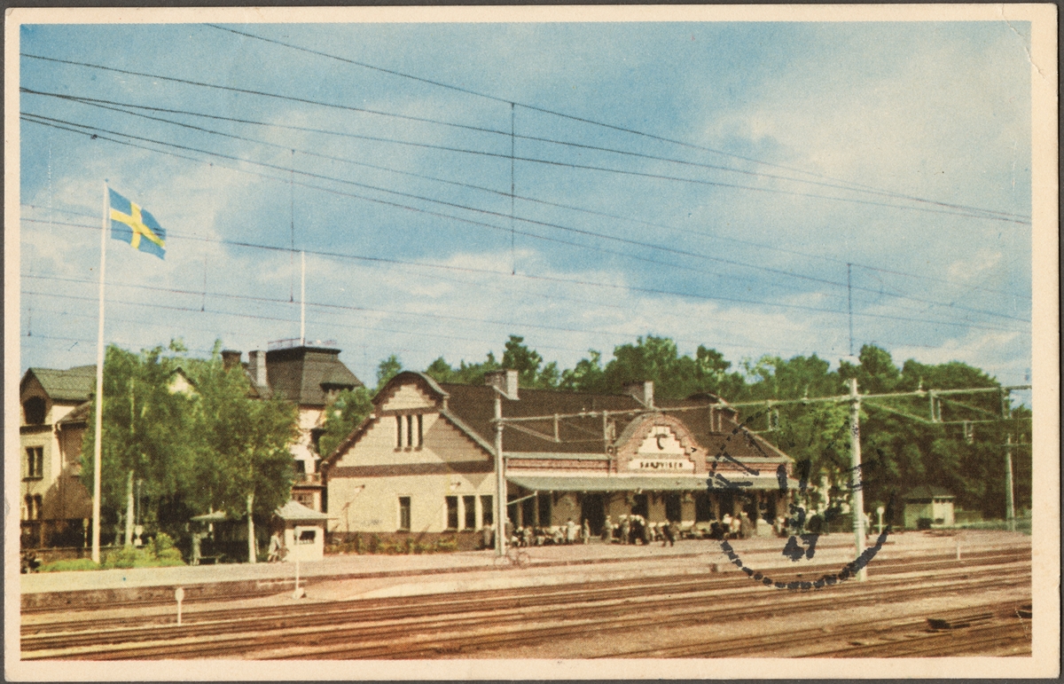 Titel: Vy på stationsområde med elektrifierad bangård.