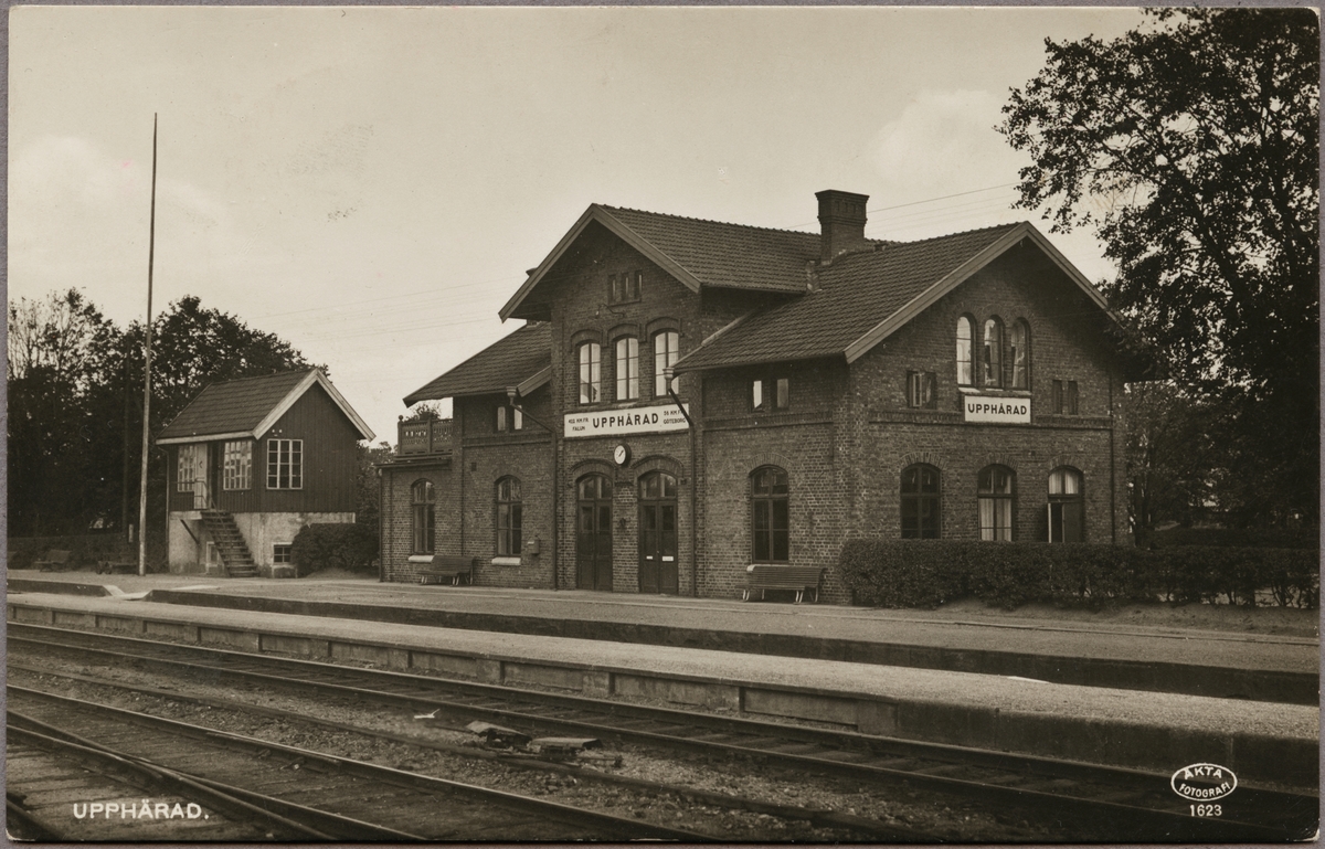 Titel: Spårsida av station med vy på stationshus och ställverk samt perrong.