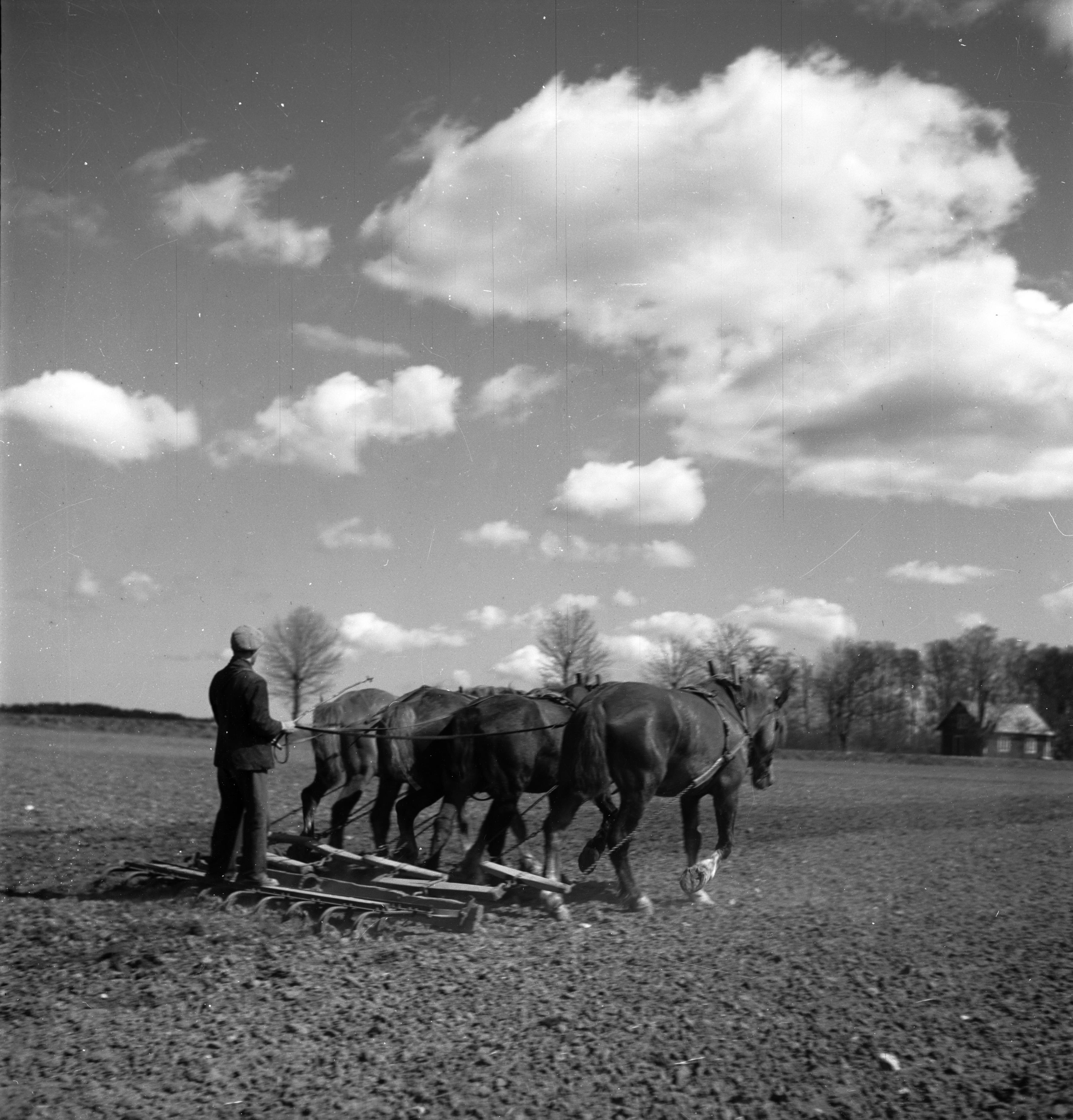 Hästar med harv. Bilden är troligen från omkring 1940.