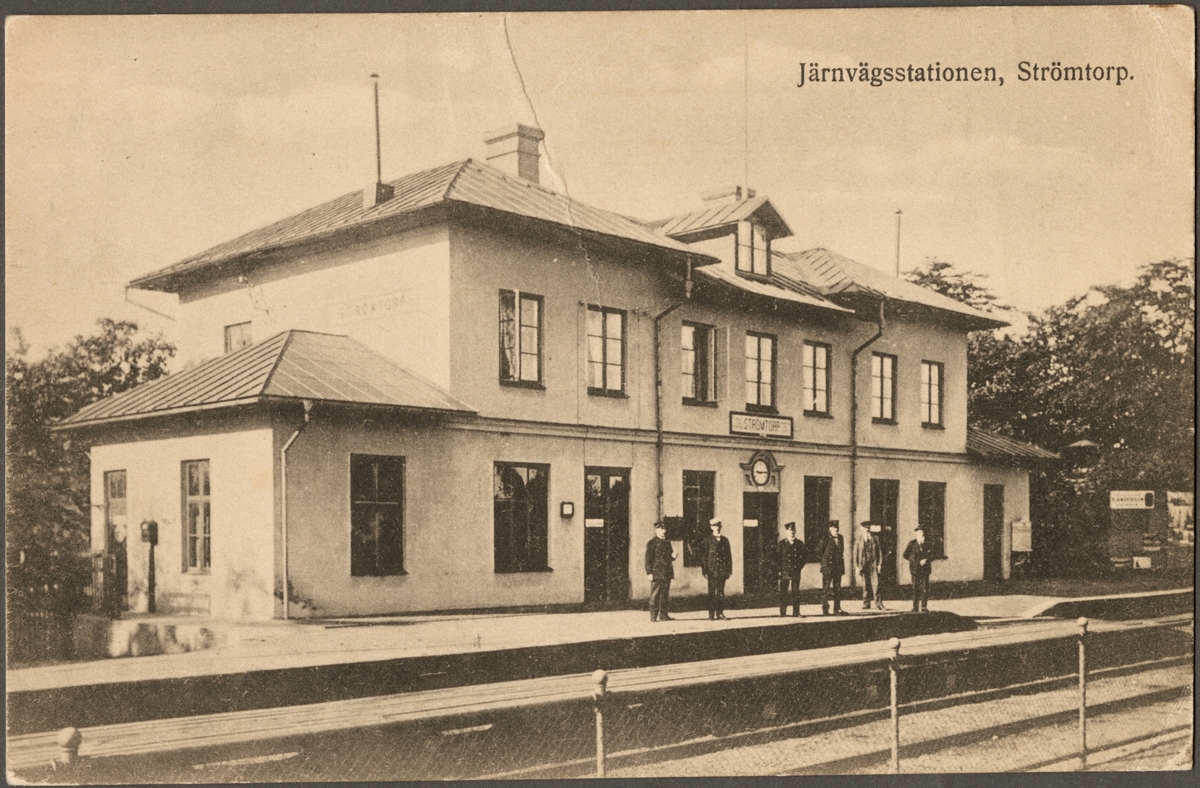 Titel: Spårsida av station med personal på perrong.