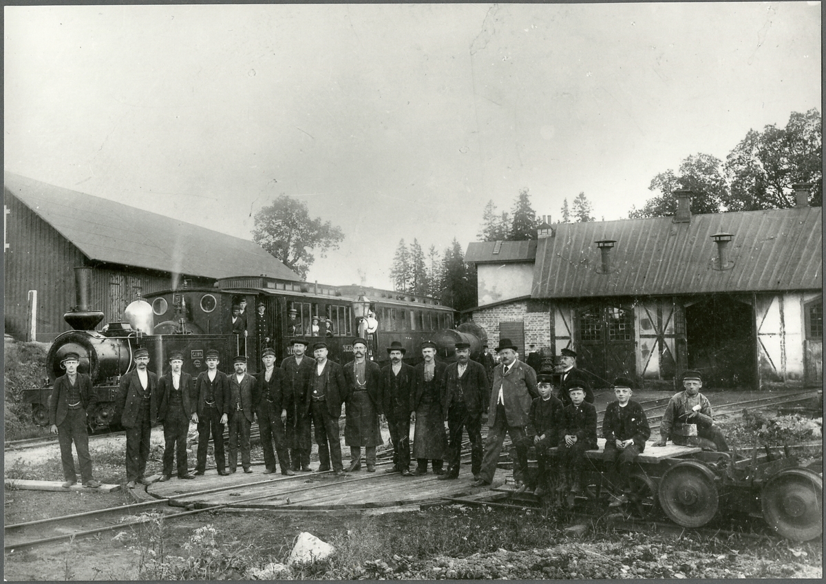 Verkstadspersonal vid Gimo stationsområde. I bakgrunden syns, Dannemora - Hargs Järnväg, DHJ Lok 2 "Gimo" med personvagn.