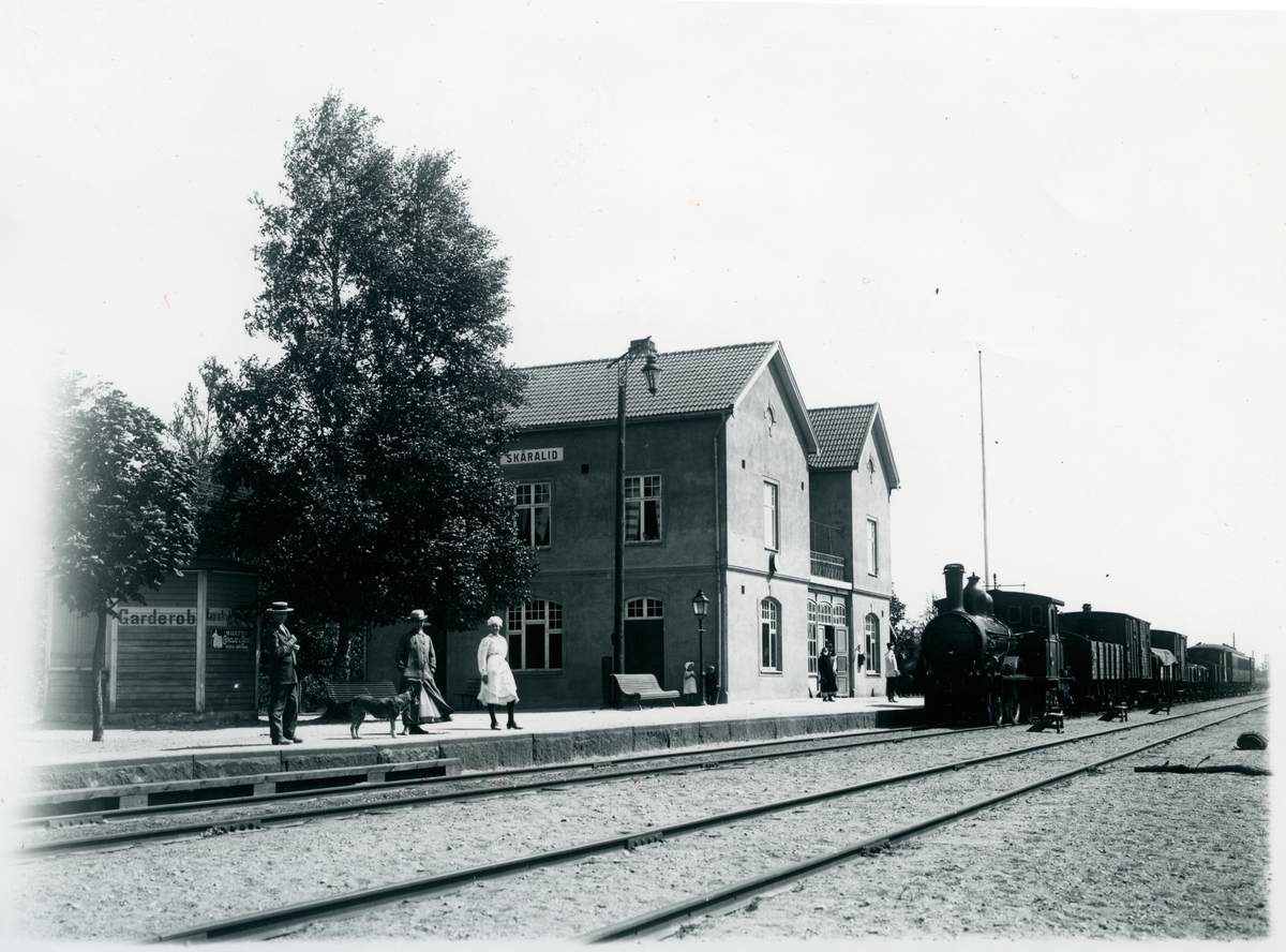 Ångtåg inne på stationen. Resande på plattformen.