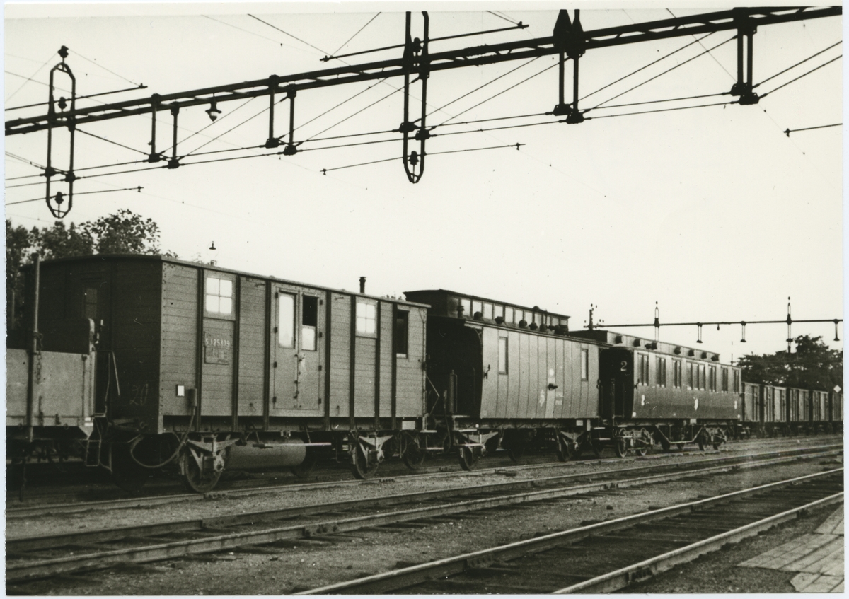 Skövde station. Del av bangården med vagnarna SJ F 25379, SJ D3 751 och SJ BCo5 1129.