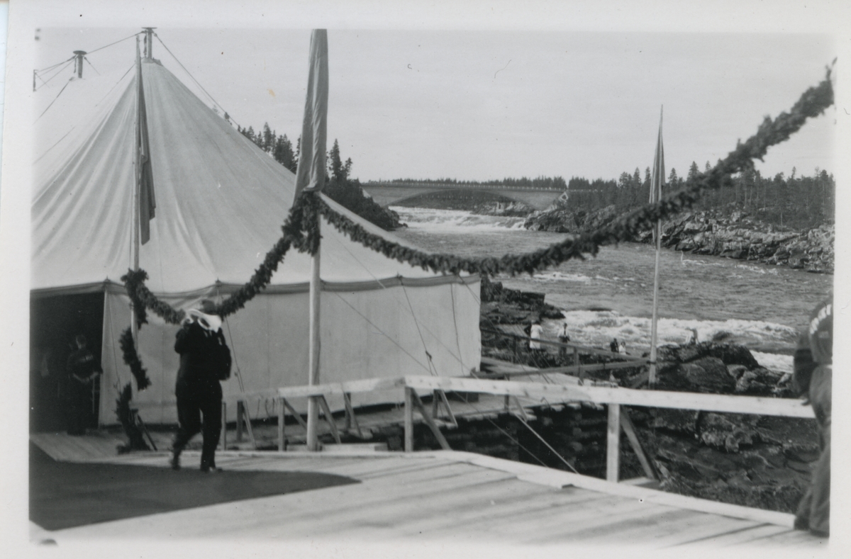 Middagstältet inför inlandsbanans invigning, uppbyggt vid Akkasfallen, strax norr om Jokkmokk.