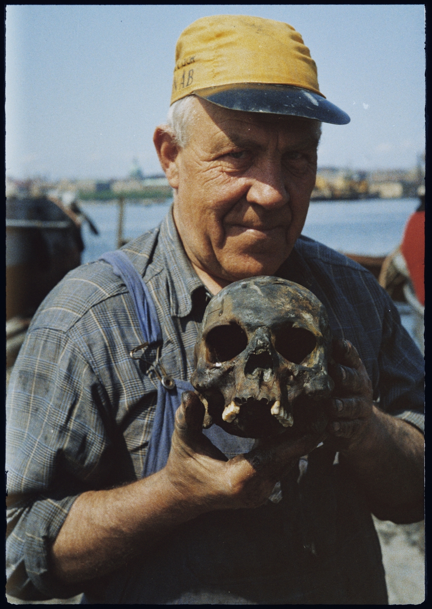 Titel: Förrådsvaktmästare Gustav Trybom håller i ett bärgat människokranium tillhörande individ A.