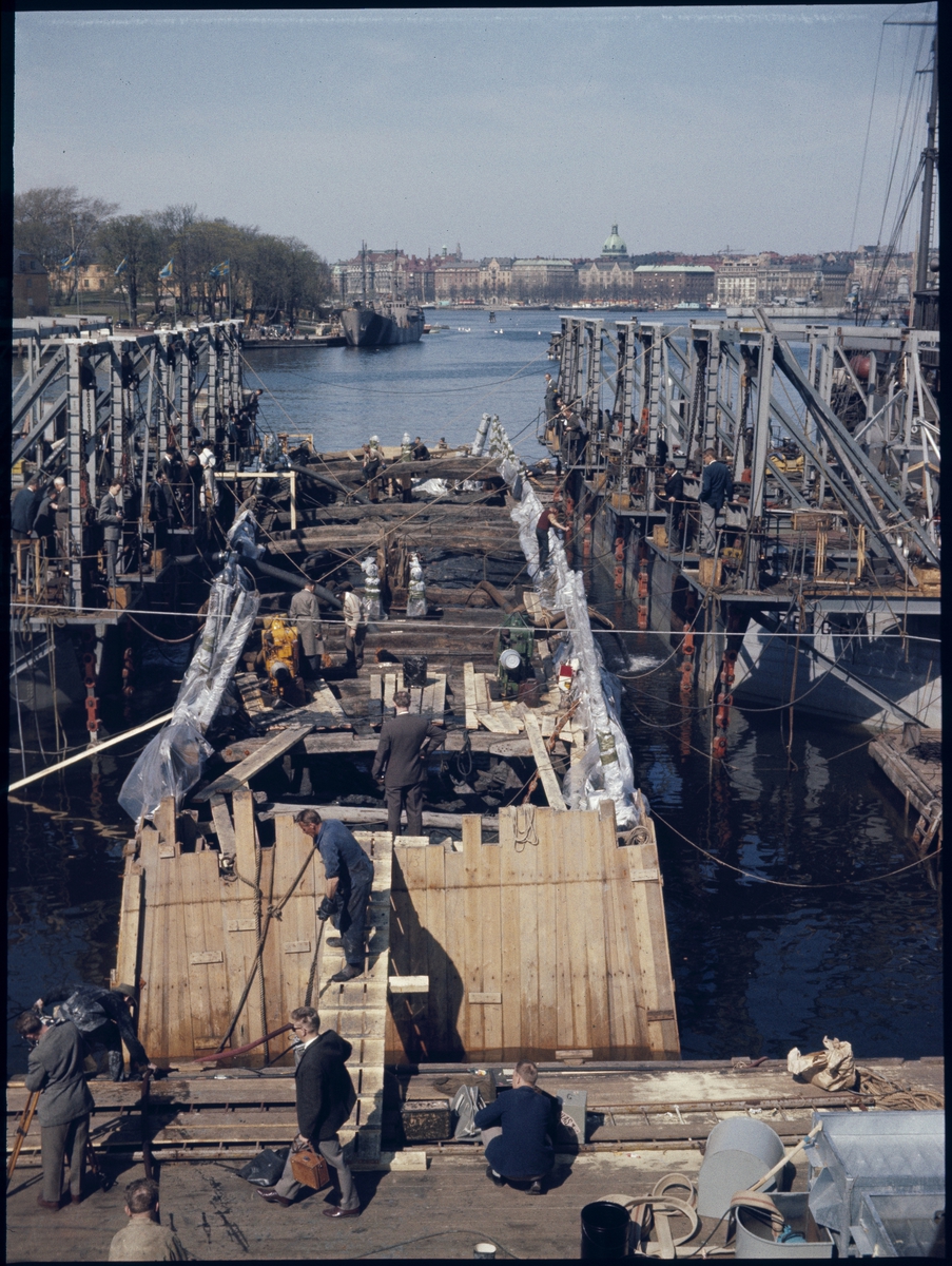 Vasa mellan de två bärgningspontonerna Oden och Frigg.