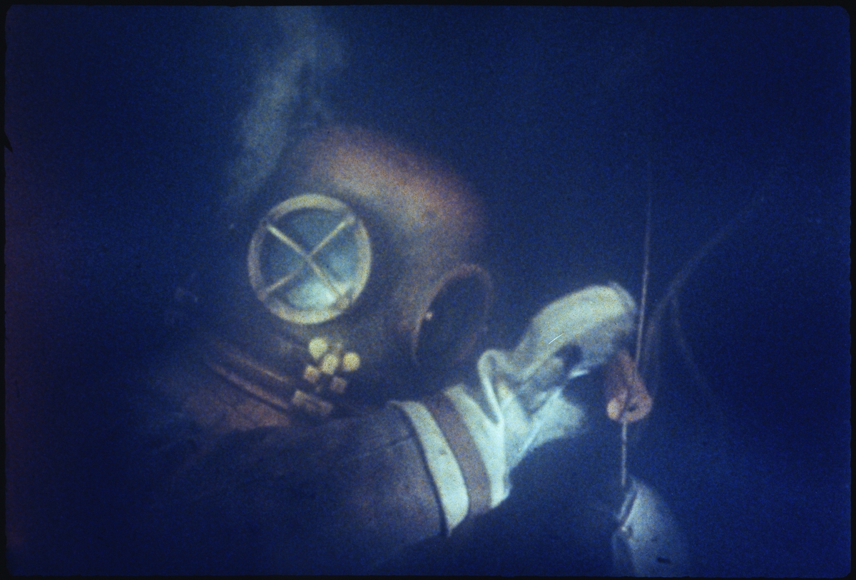 Titel: En av dykarna arbetar under vattnet med att täta alla de bulthål som fanns i Vasa vid bärgningen.