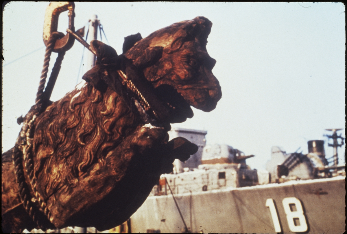 Vasas galjonsfigur, utformat som ett lejon, under bärgning. Lejonets man glänste ännu av guld vid bärgningen.