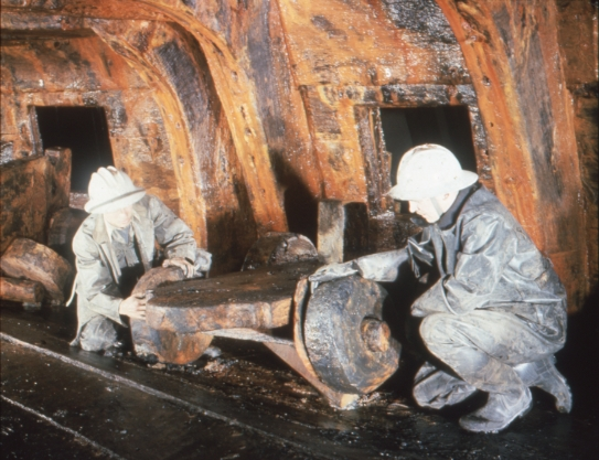 Arkeologer vid en kanonlavett på Vasas undre batteridäck. Till vänster Jonas Ferenius och till höger Bo Wingren.