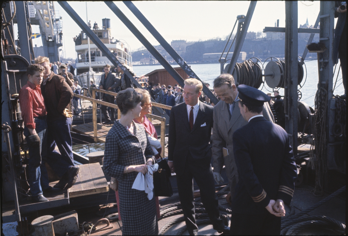 Edward Clason pratar med bl.a prinsessan Margaretha i rutig dräkt vid bärgningen av Vasa.