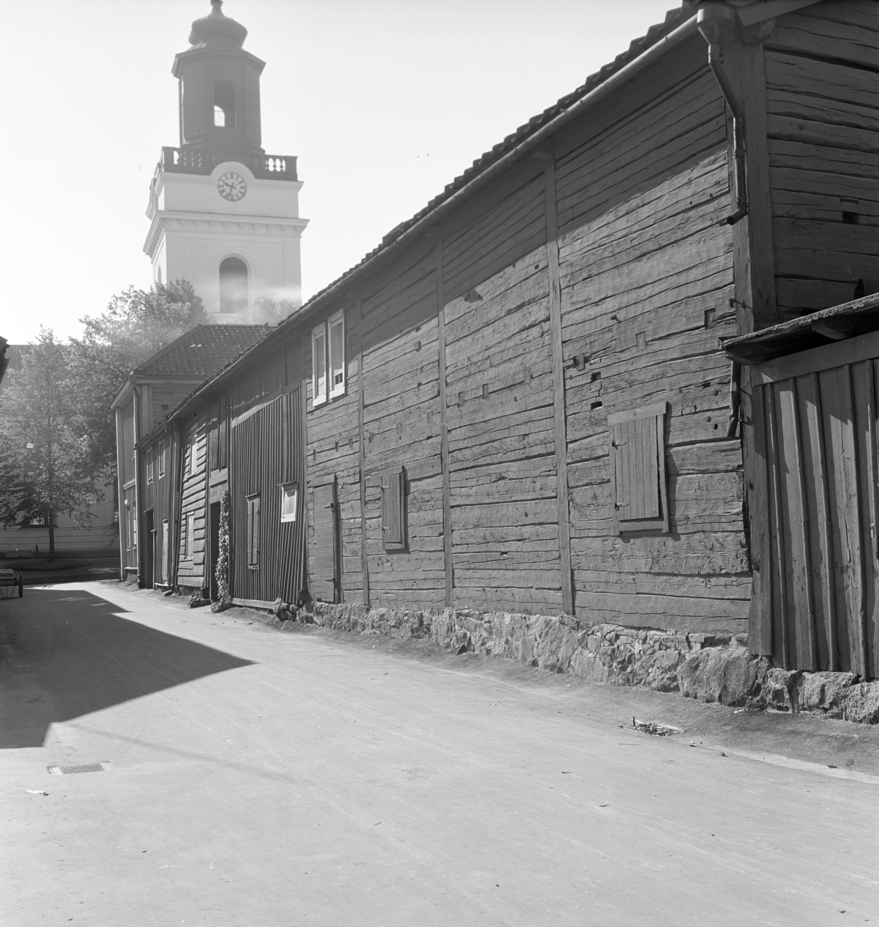 Trähus, kyrkan i bakgrunden. Bilden tagen på 1940-talet.