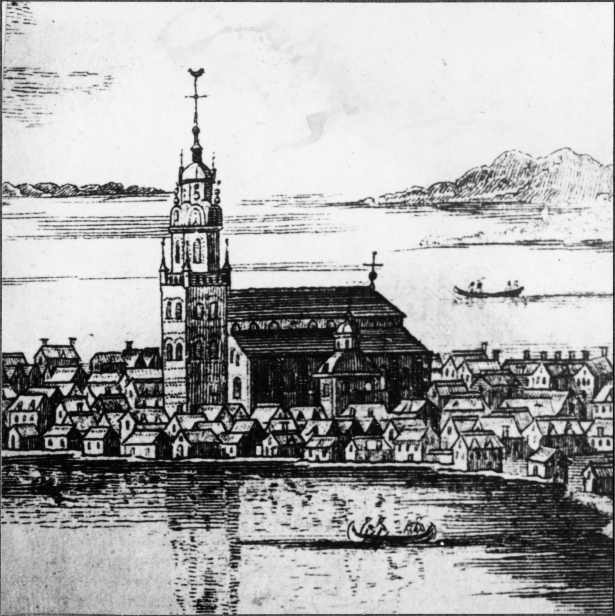 Avfotografering av kopparstick av kyrkan mot söder omkring 1690.