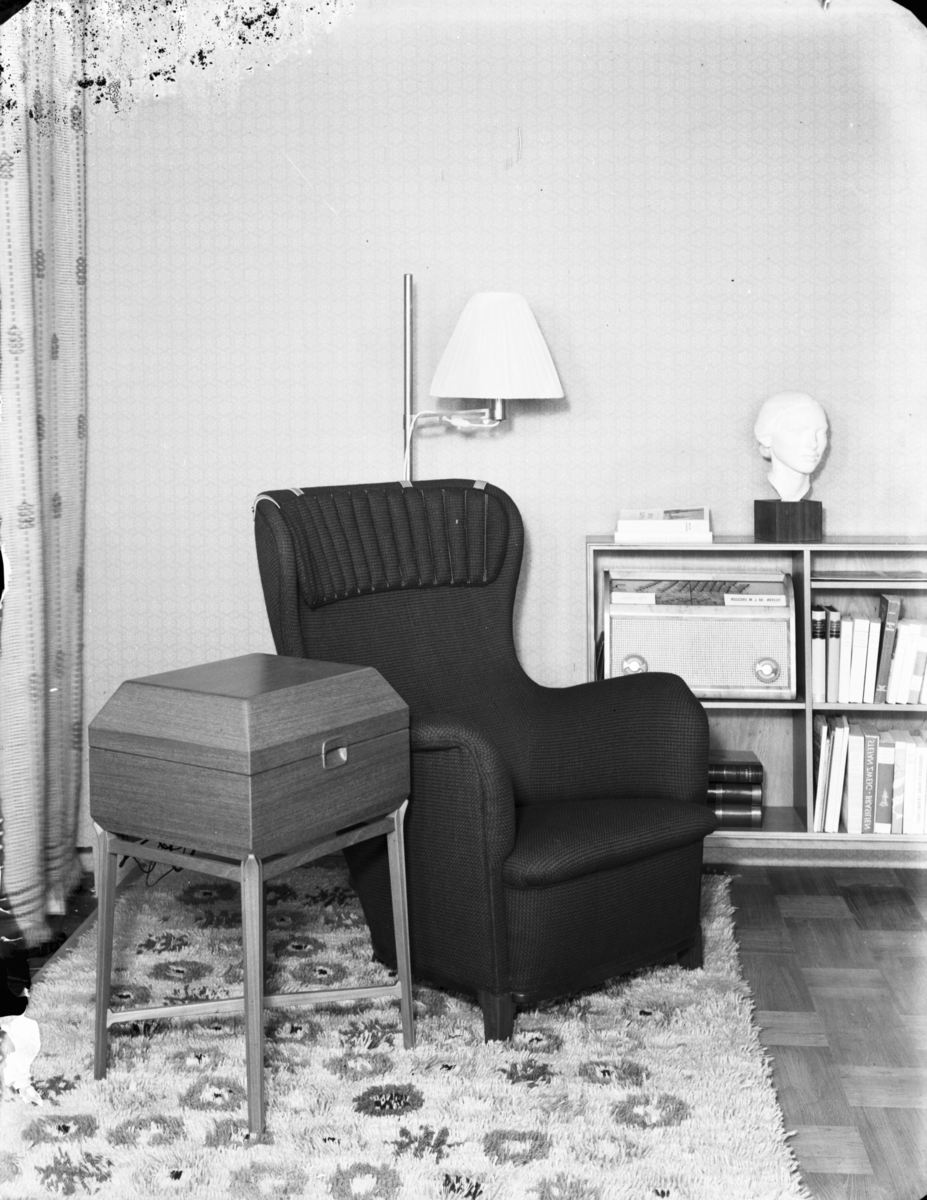 Fåtölj, skåp, hylla med radio och ryamatta