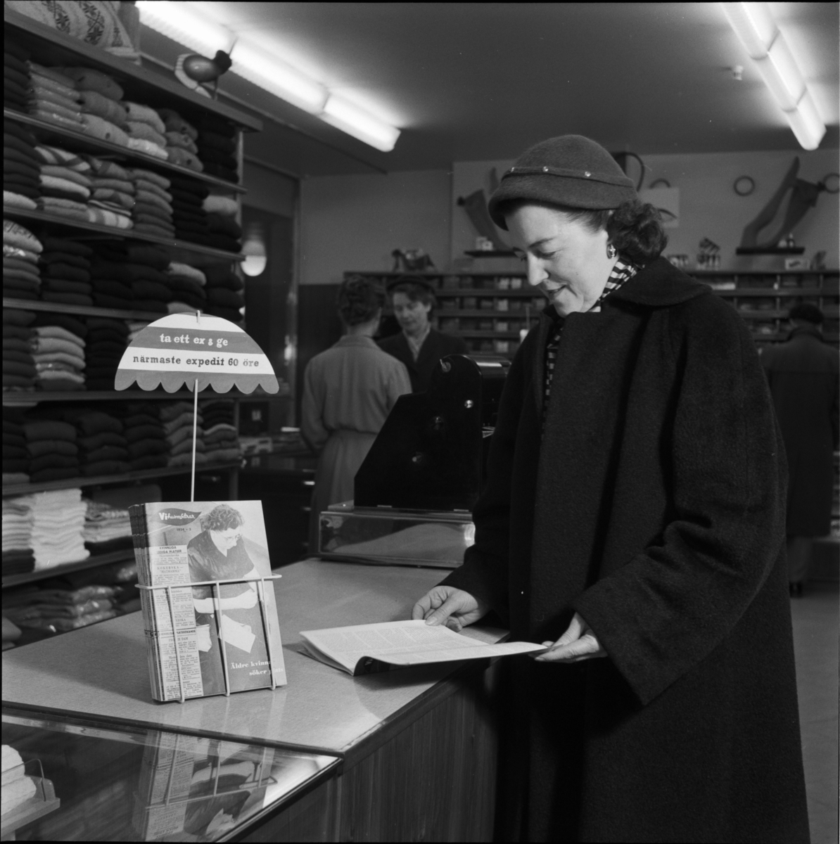 Titel: SKYLTSTÄLL FÖR TIDSKRIFTEN VI HUSMÖDRAR Å AFFÄRSDISK