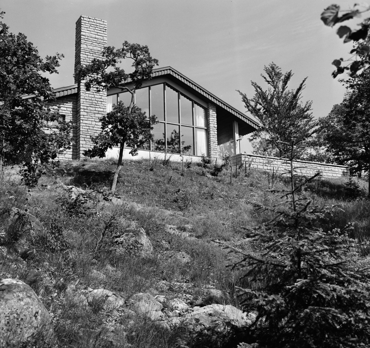 Exteriör, glasad gavelfasad som vetter mot grönskande, nedåtlutande sluttning