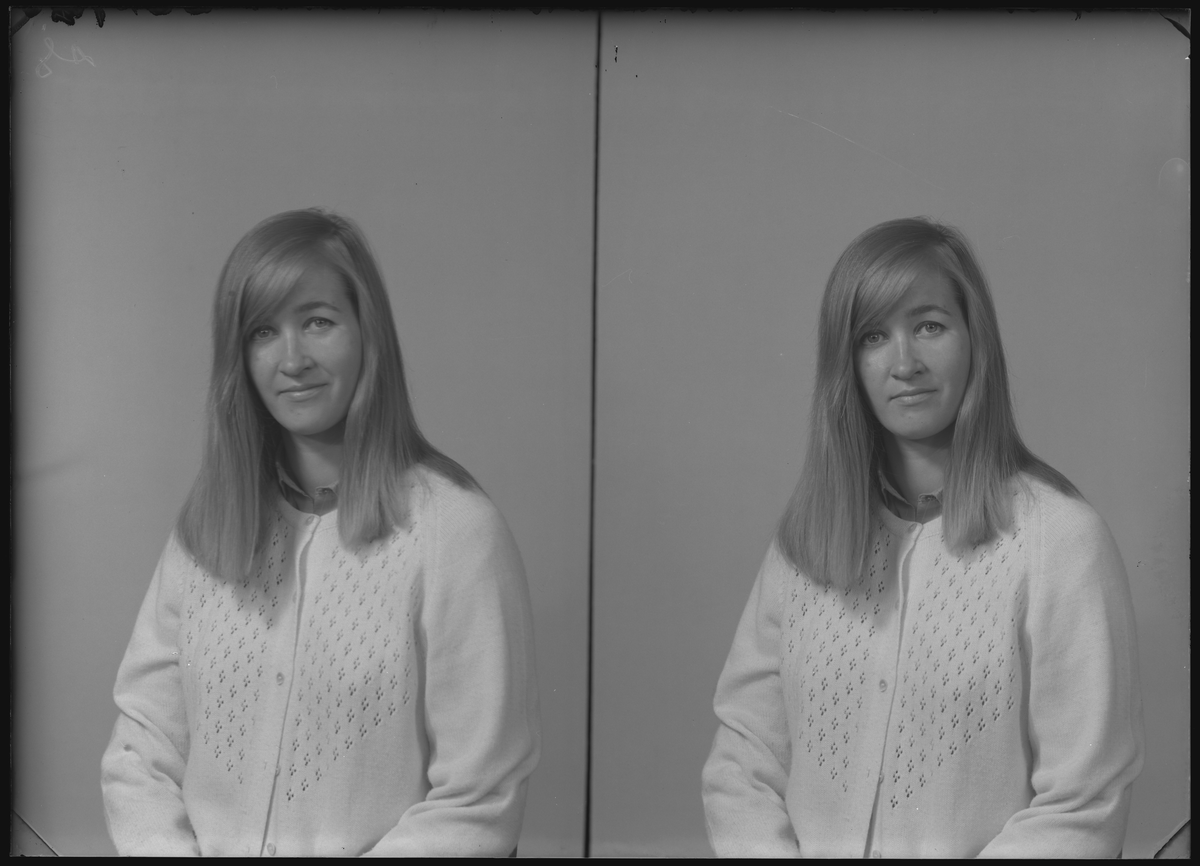 Kvinnoporträtt, pass. Ingegerd Lindberg, Stationsgatan 12B, Kolbäck. Ur Gustaf Åhmans samling.