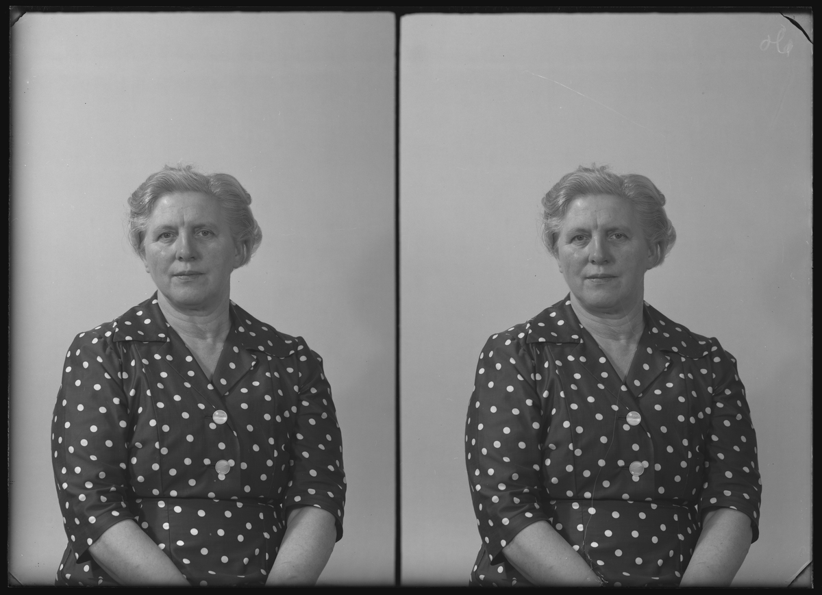 Kvinnoporträtt, pass. Fru Alice Andersson, Eriksgatan 4, Kolbäck. Ur Gustaf Åhmans samling.