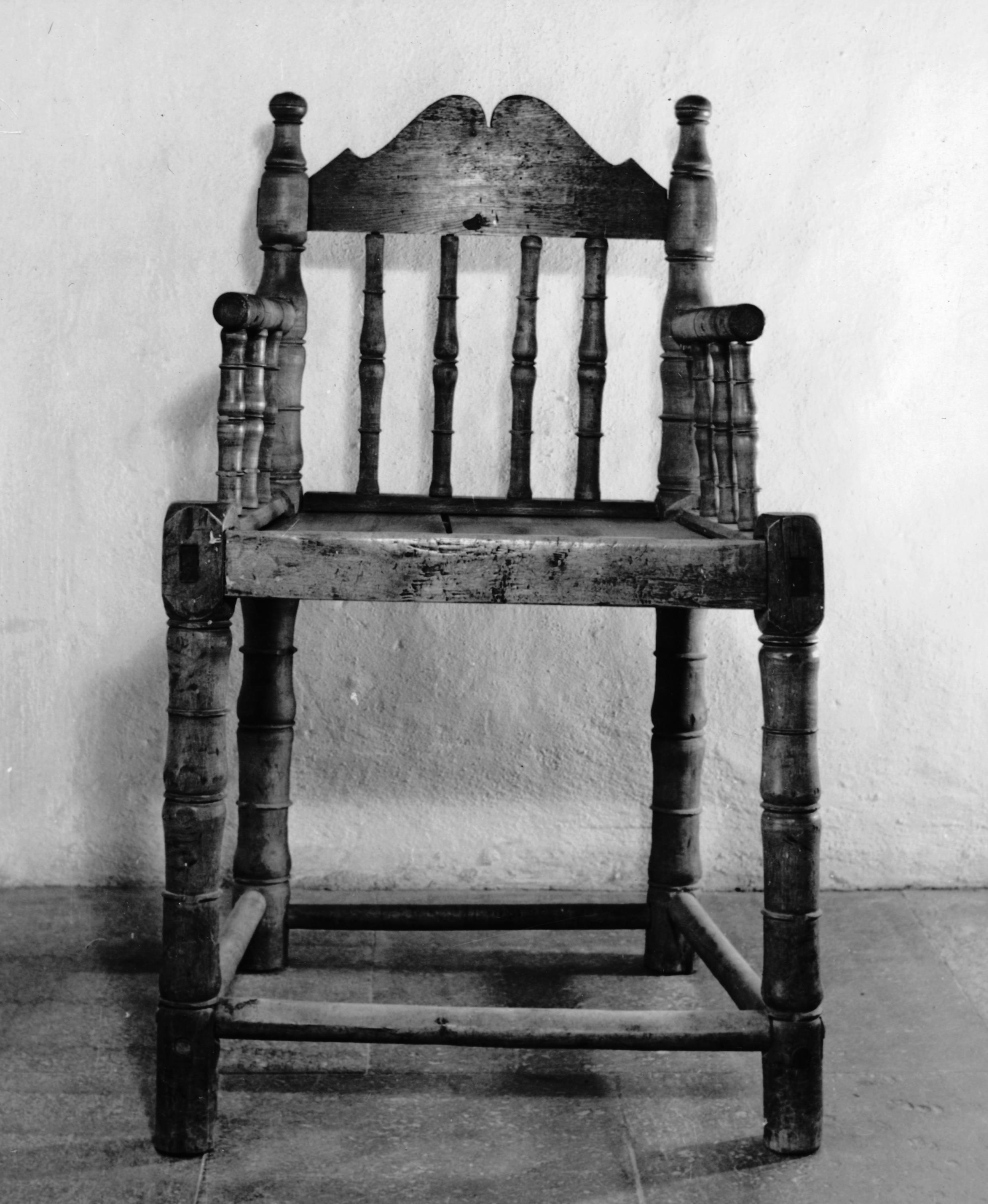 Stol av ek och björk, möjligen av medeltida delar, men starkt förändrad. 1700-talet.