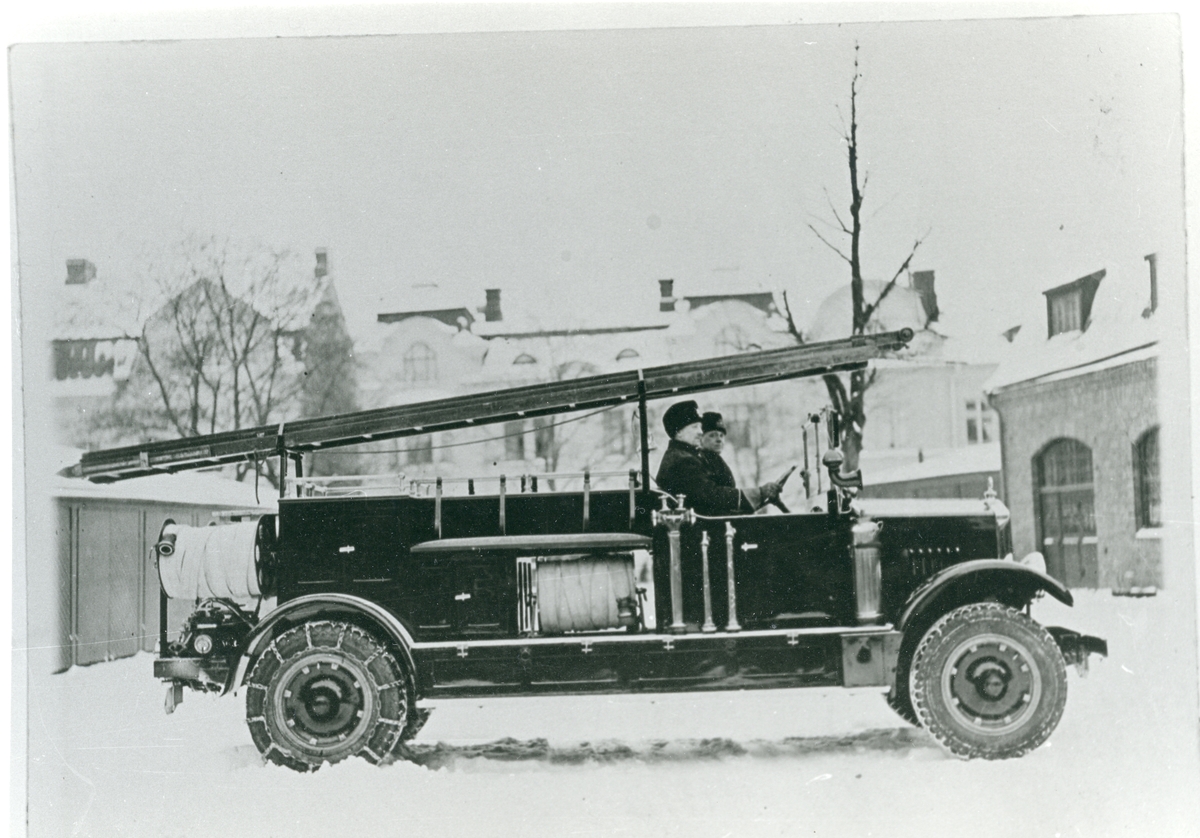 O. Clarholm och O. Thorgren i nya brandbilen, 1932.