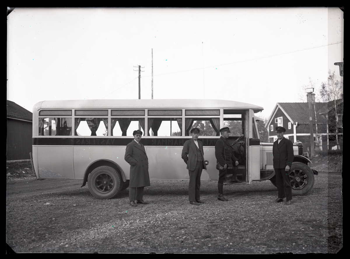 Fyra män står bredvid buss. Magnusson, Hallstahammar.