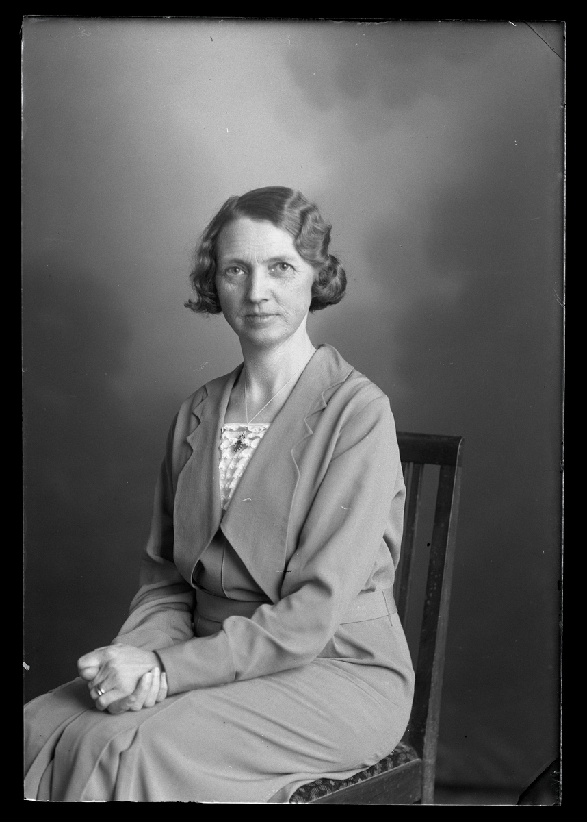 Kvinnoporträtt, körkort. Fru Nyström, Gamla Skolan, Hallstahammar.