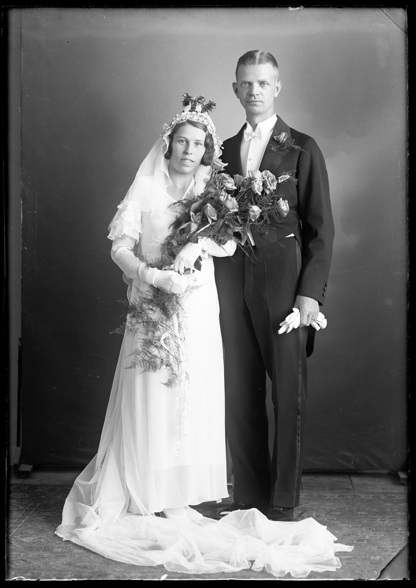 Brudpar, Sture Lindgren, Brännkyrkogatan 120, 1 tr., Stockholm, anteckning på försättspapper Leonar Vitt.