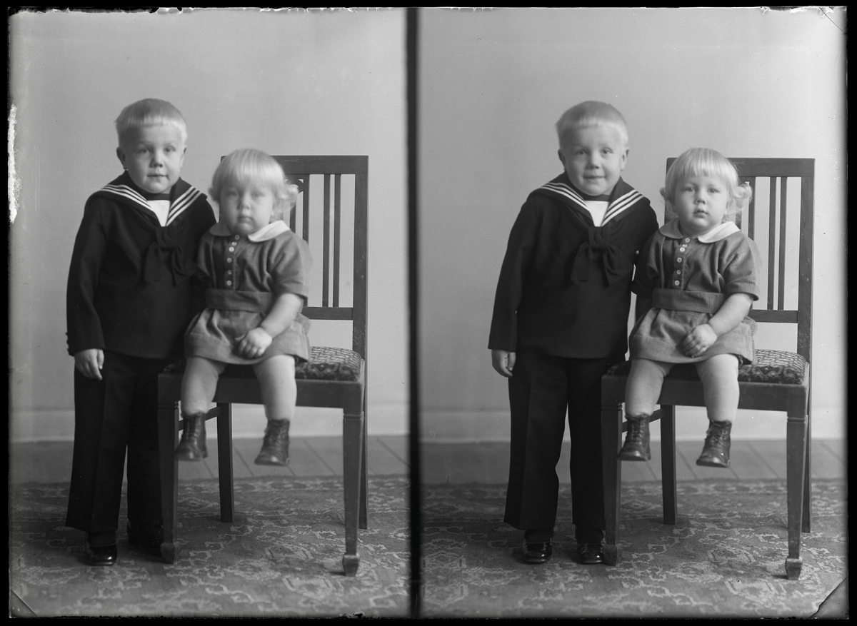 Grupporträtt, två barn (Lars och Olle). Erik Andersson, Gränby, Kolbäck.