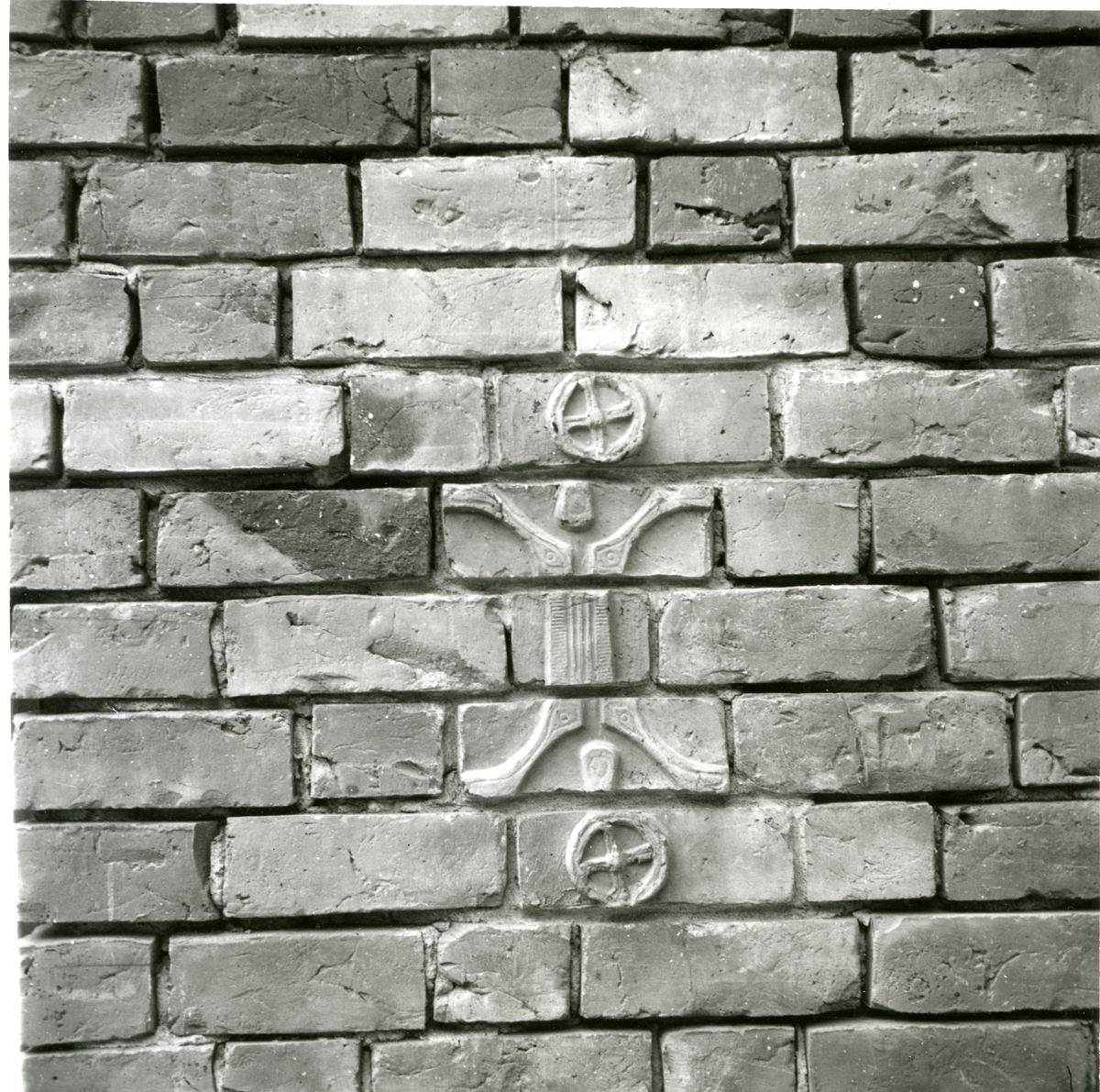 Titel: Västerås, Kyrkbacken, kv. Heimer. Figur på Landsbibliotekets vägg, troligen 1930-talet.