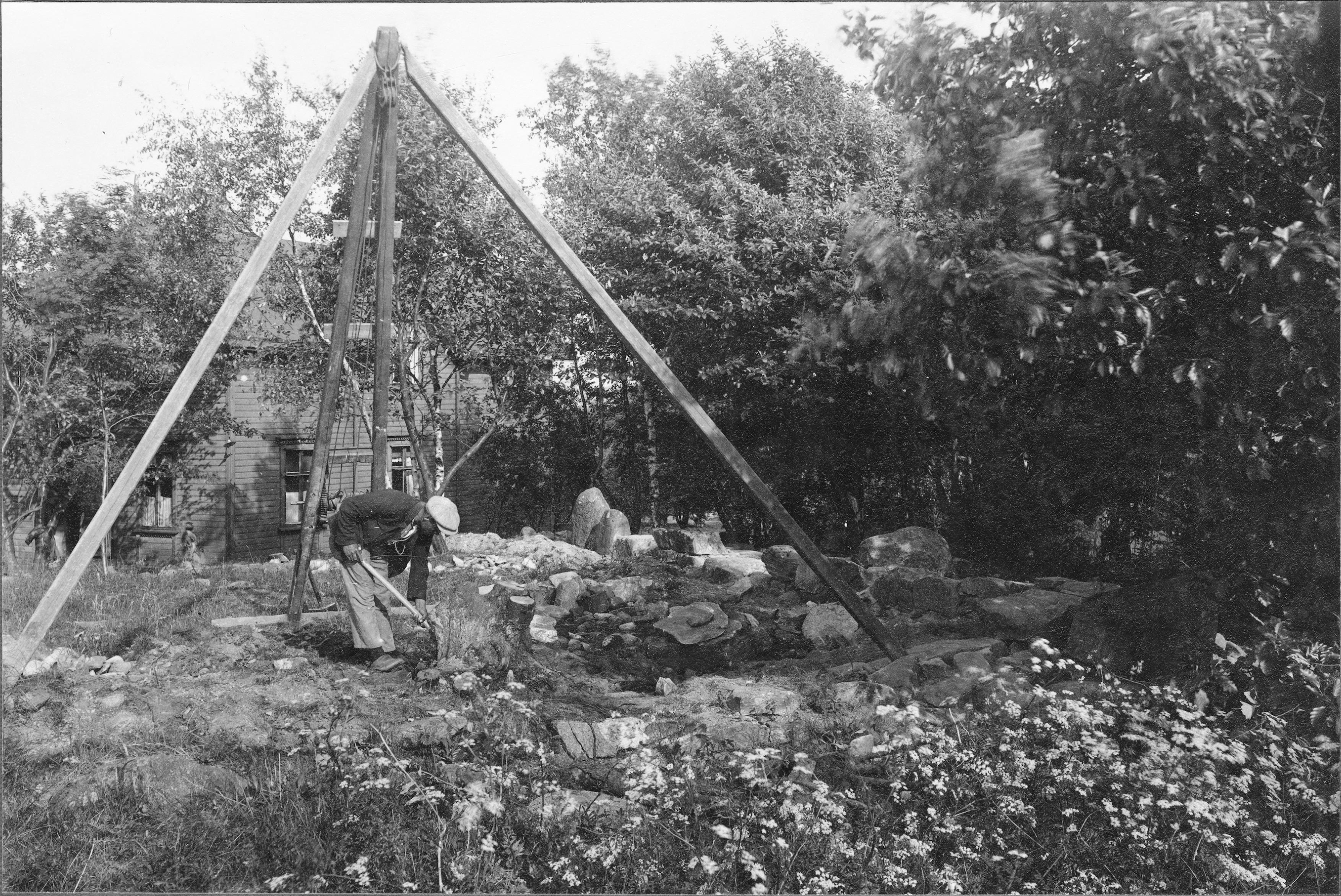 Utgrävning av kyrkplatsen. Södra långväggens innersida, mot korpartiet. Uppdragning av stubbar.