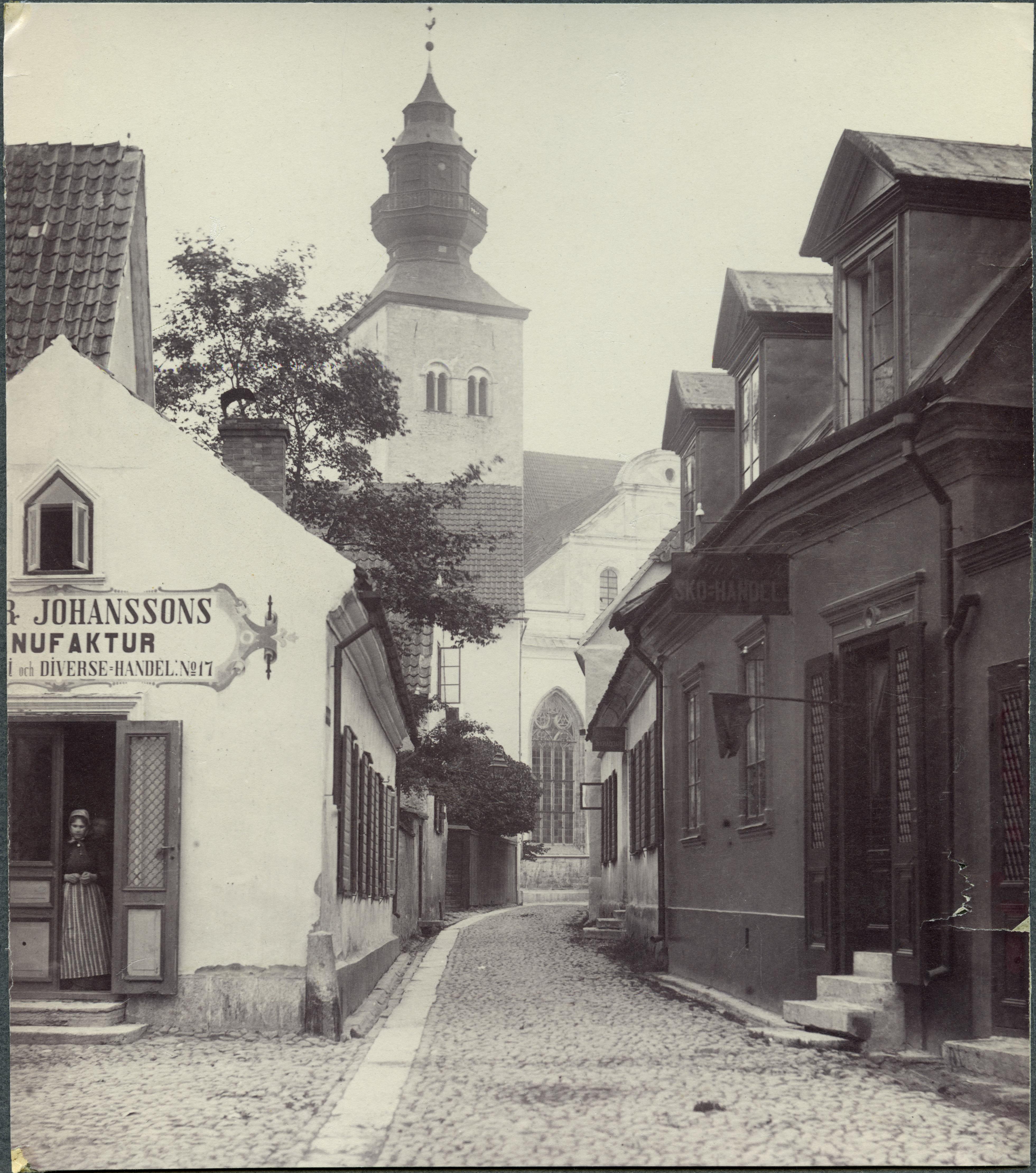 Gatubild. I mitten av bilden syns Visby domkyrka, Sankta Maria.
