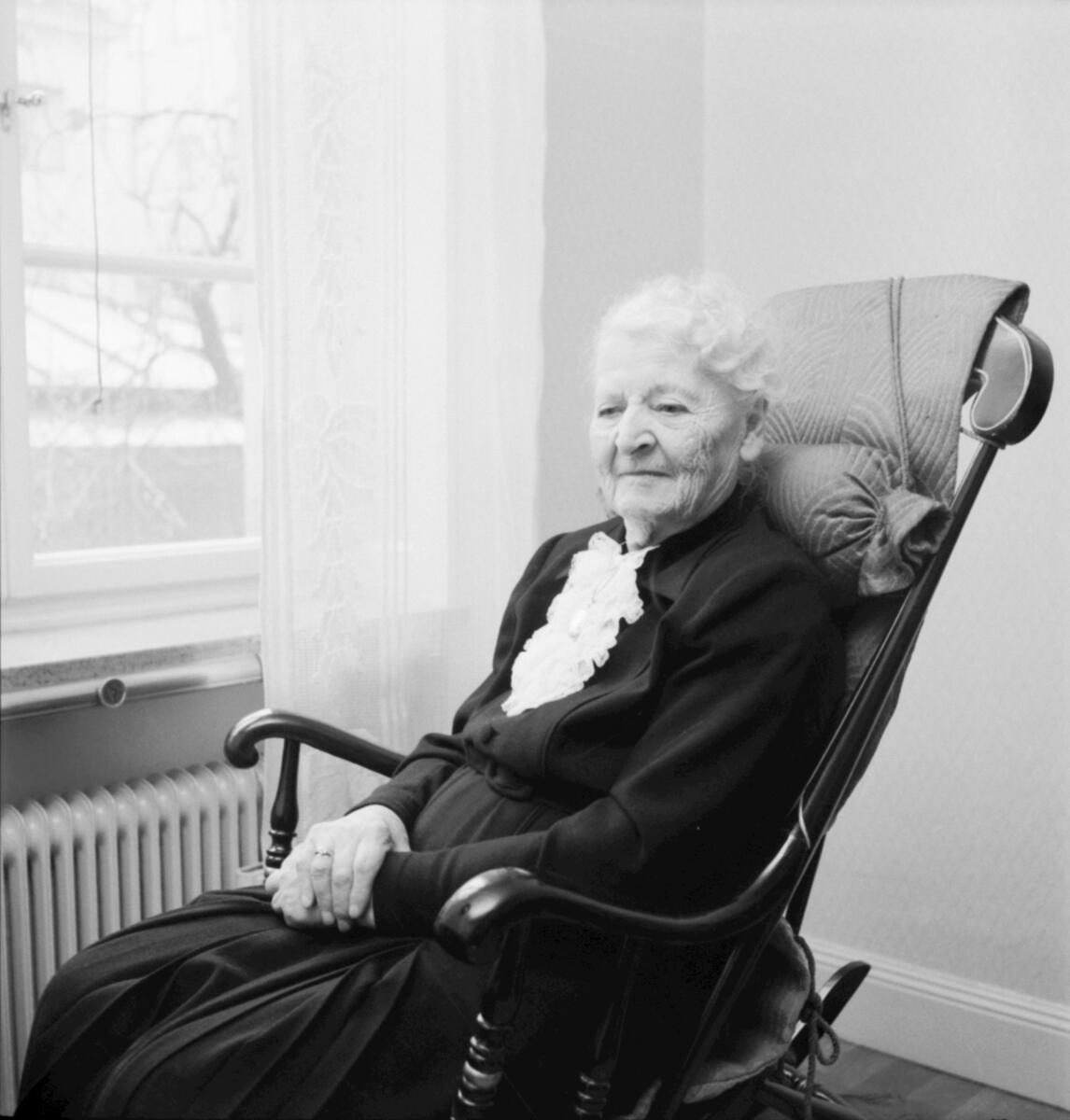 Fröken Rut Carlsson, porträtt gammal moder + grupp 2 systrar - moder