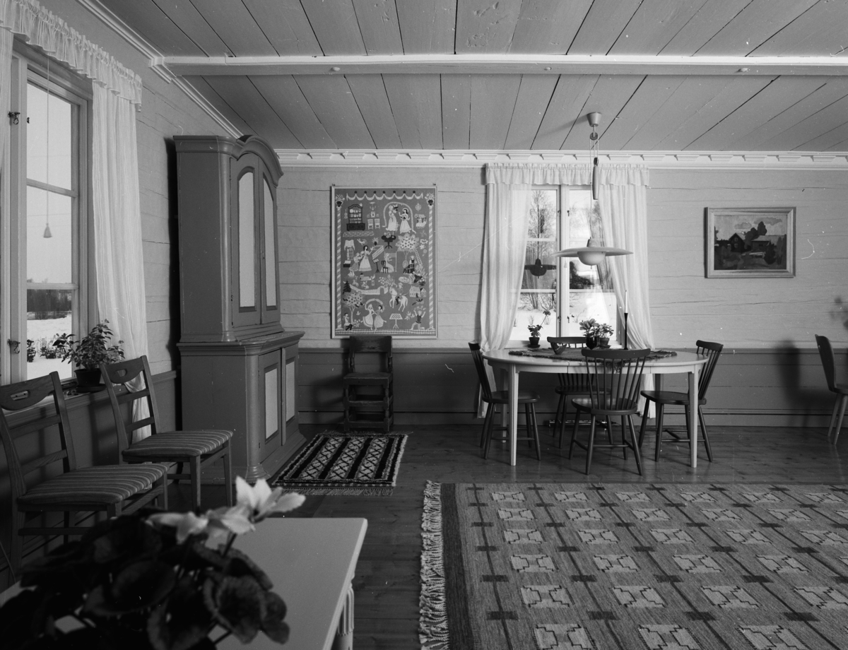 Interiör av vardagsrum med matsalsbord och skänkskåp