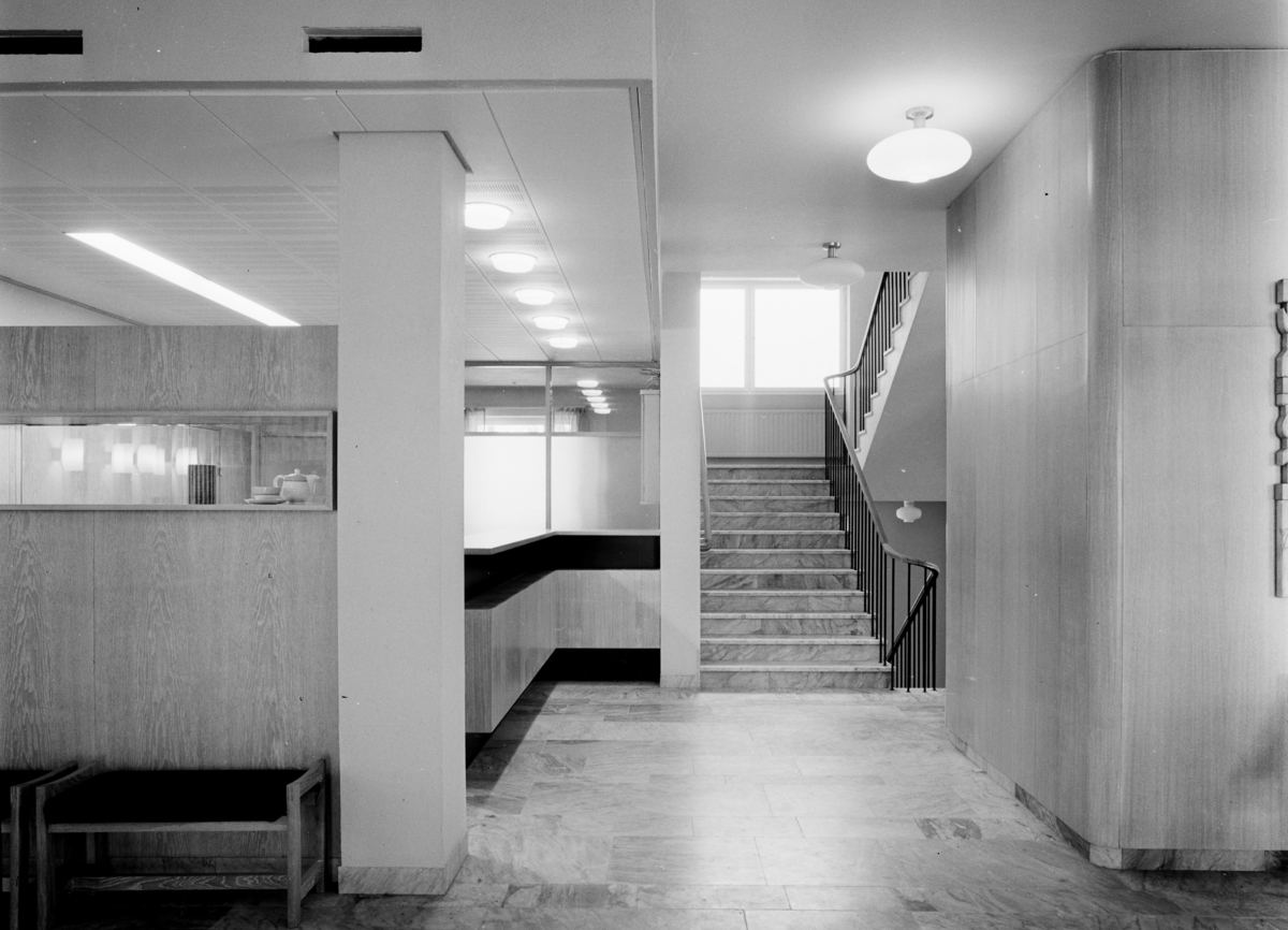 Interiör av vestibulen med receptionen, i fonden trappa till övre våningsplan