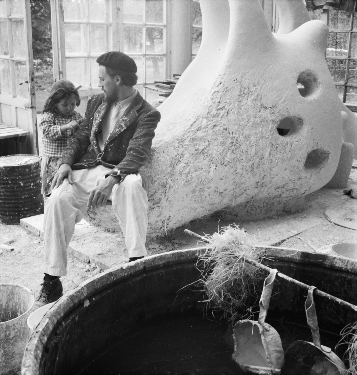 Porträtt av konstnären Egon Møller-Nielsen med dottern Mona framför lekskulpturen Tuffsen