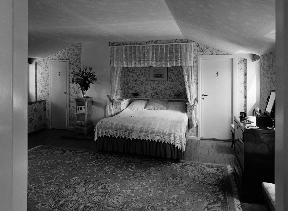 Interiör av sängkammare med himmelssäng och småblommiga tapeter